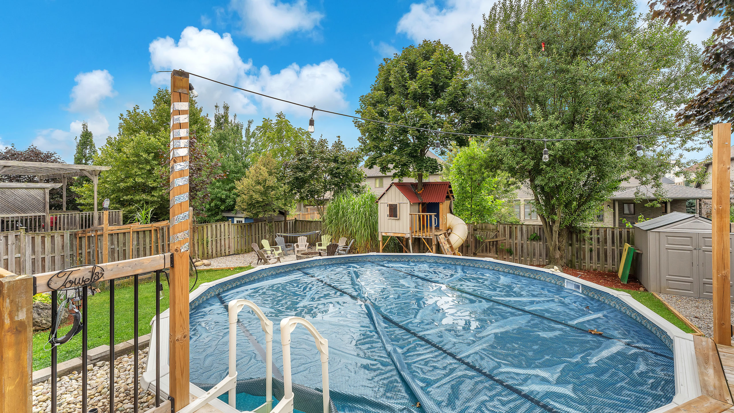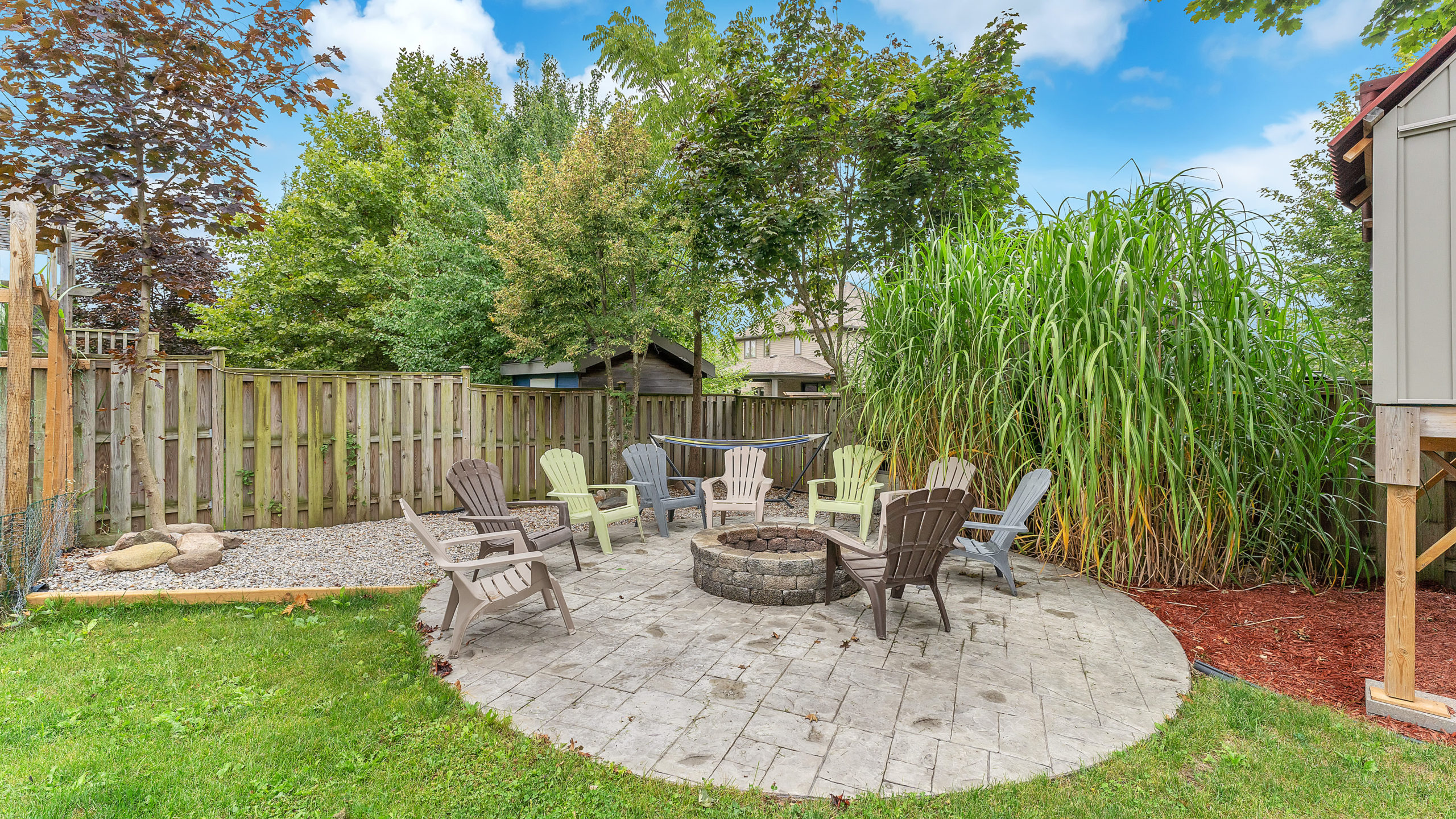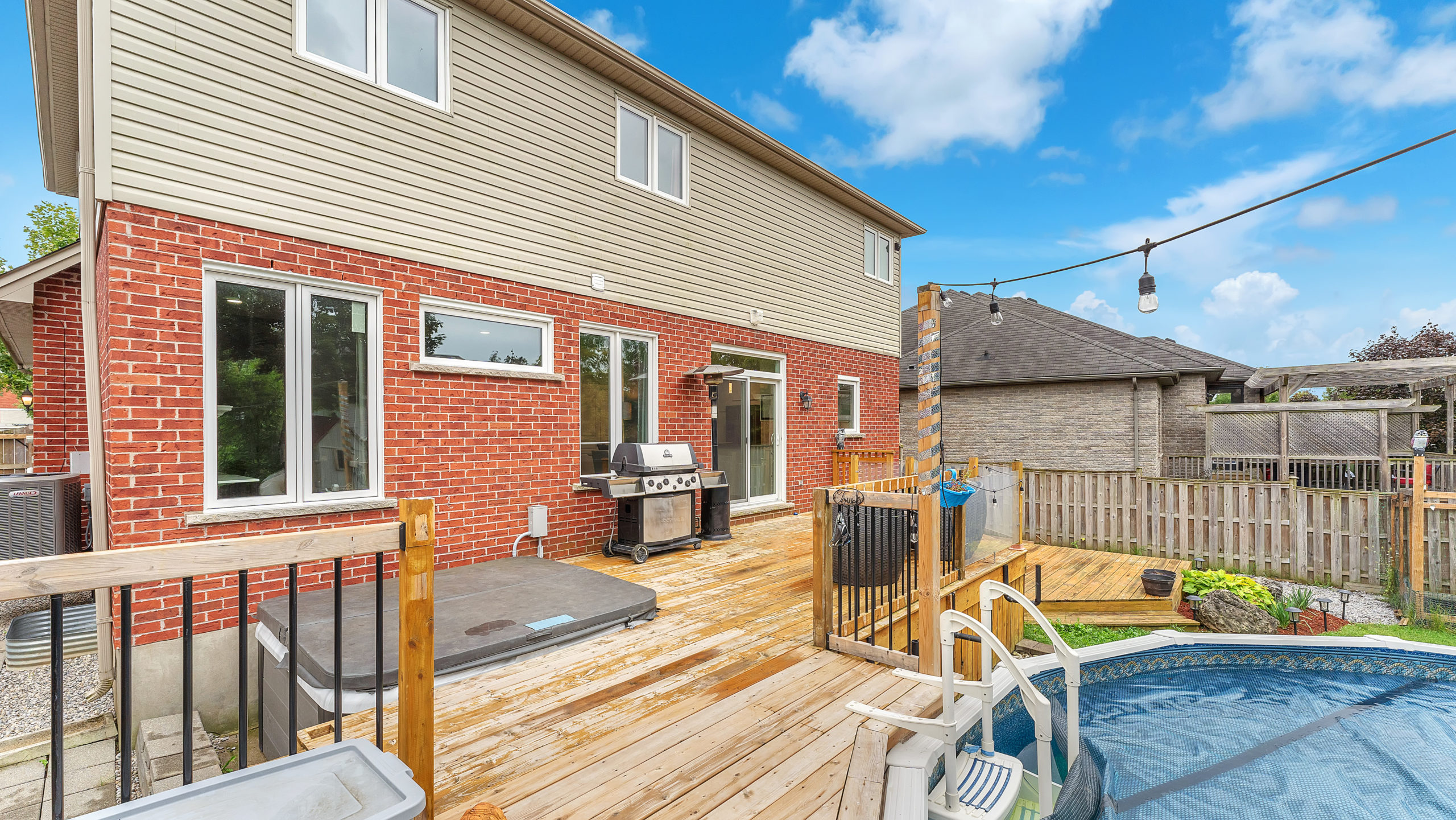 Sliding doors lead to your private backyard oasis, featuring a stamped concrete firepit area, two-level deck, relaxing hot tub, and 21-foot above-ground pool – creating the ultimate space for family entertainment and outdoor enjoyment.