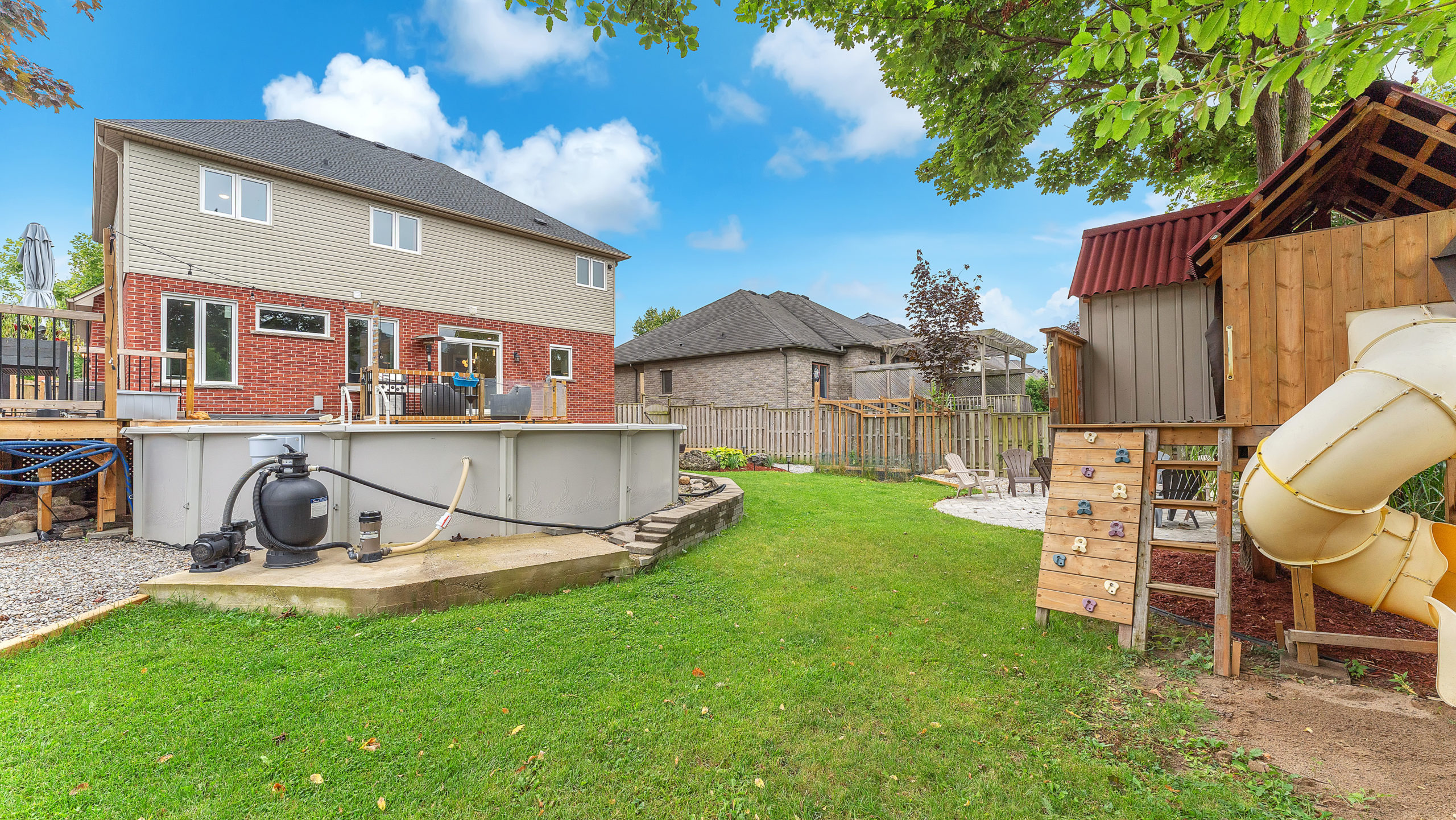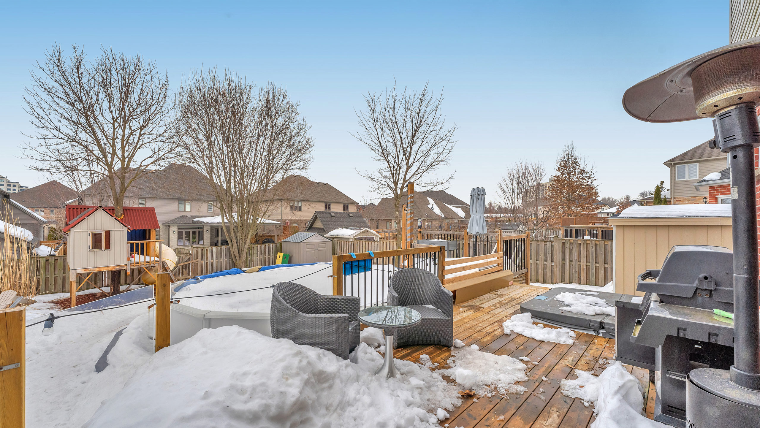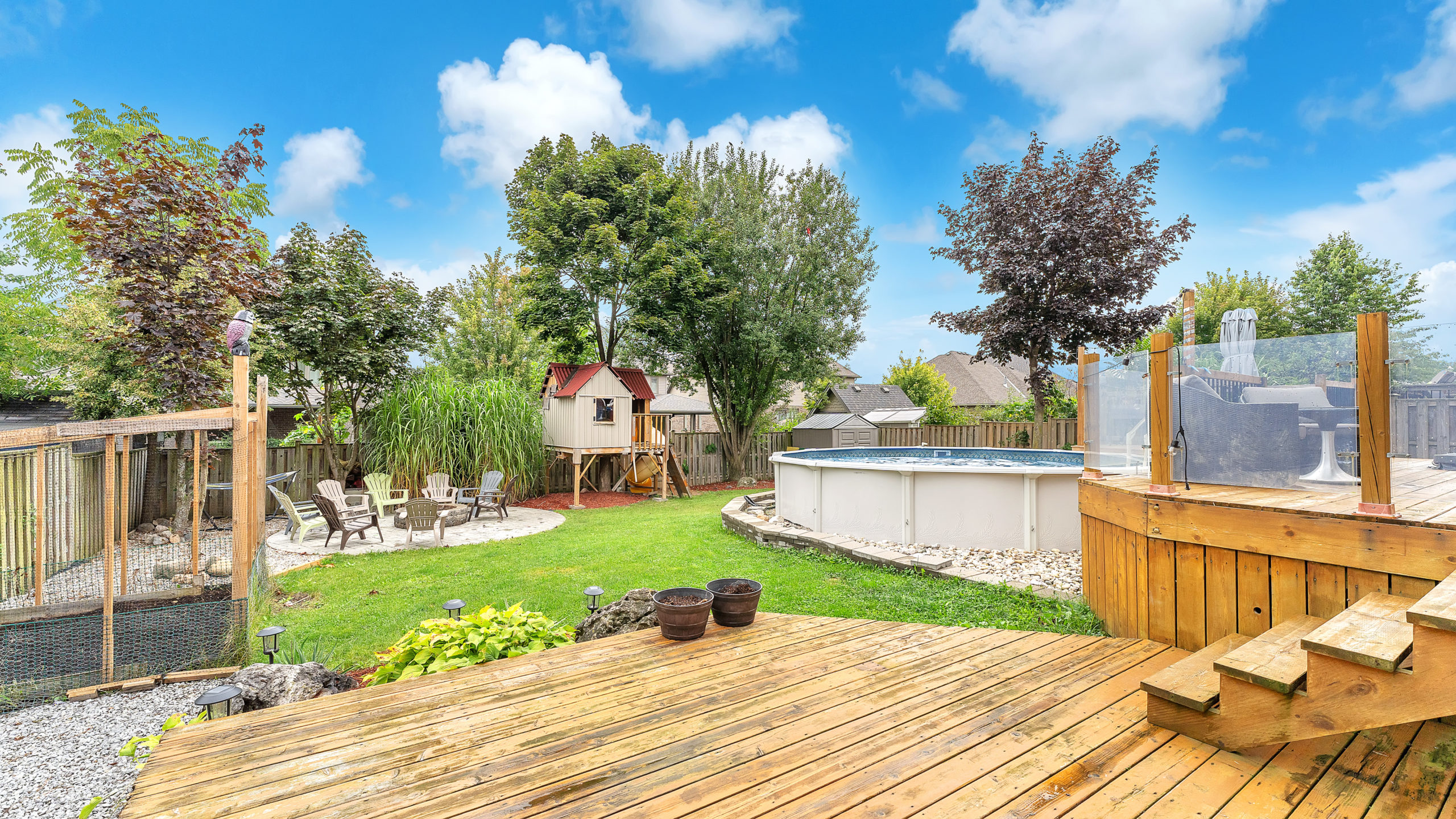 Sliding doors lead to your private backyard oasis, featuring a stamped concrete firepit area, two-level deck, relaxing hot tub, and 21-foot above-ground pool – creating the ultimate space for family entertainment and outdoor enjoyment.